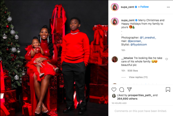 Makeup mogul Supa Cent, who just recently shared that she’s now dating rapper Sage The Gemini, shared an image of herself in a red gown with her son and daughter by her side.