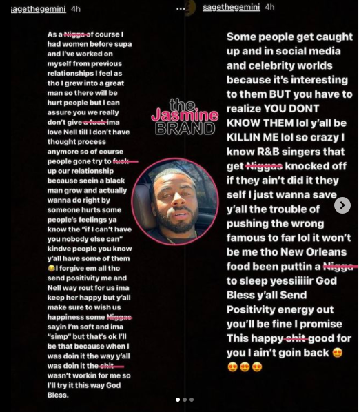 “I was with 1 man for 3 ½ years. Another for 3 months (that was my bad because n*ggas can only front for so long.) and Sage was before BOTH OF EM. Idk if ya’ll upset because I moved on or because who I post. Ya’ll be more stuck on them n*ggas than me.”