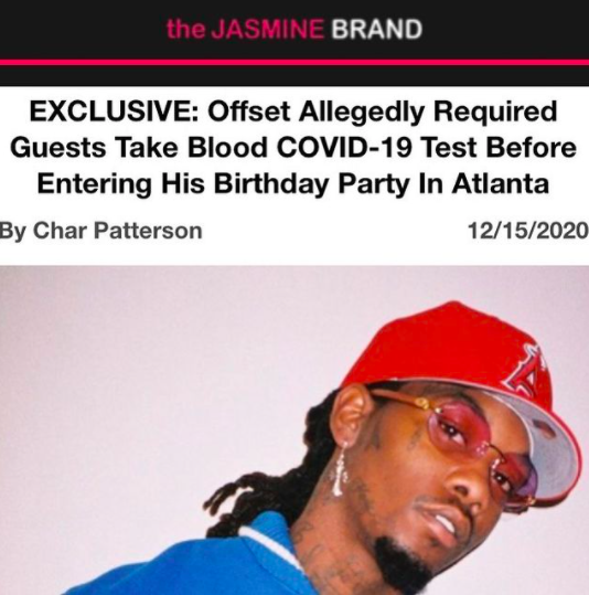 theJasmineBRAND exclusively reported that Offset allegedly required his guests to take a blood version of a COVID-19 test before entering his 29th birthday party earlier this month. They reportedly had to wait for the results before they were allowed inside.