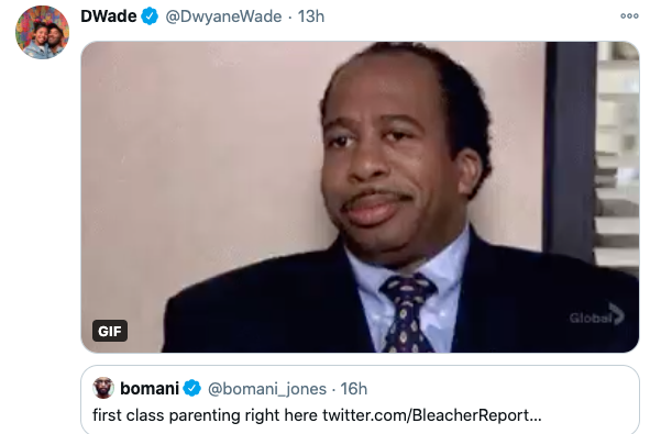Dwyane Wade took to his Twitter to respond to a fan who called the win “first class parenting,”–a simple GIF, nodding in agreement.