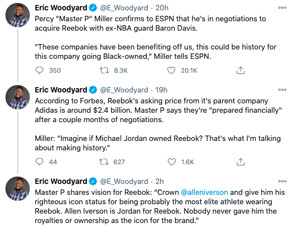 Percy “Master P” Miller confirms to ESPN that he’s in negotiations to acquire Reebok with ex-NBA guard Baron Davis.