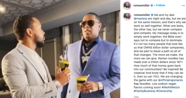 Me and my dad @masterp are night and day, but we are on the same mission, and that’s why we work so well together. What one lacks, the other has, but we never compare and compete. My message today is to simply work together; the Bible even says not to compete but to dominate. It’s not too many people that look like us that OWNS billion dollar companies, and we plan to blaze a path so all of that changes. The more we make, the more we can give. Ramen noodles has made over a trillion dollars since 1971. How much of that money goes back into our communities? Be inspired! Be creative! And know that if they can do it, then so can YOU. We are changing the game with our @officialrapsnacks Rap Noodles. Low sodium vegan flavors coming soon! #WeAllWeGot #FamilyBusiness #Ownership