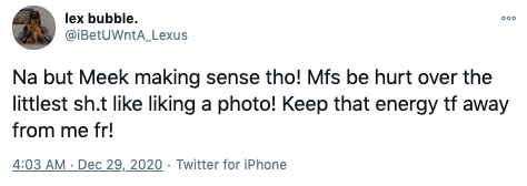 “ima have a better reaction in 2021… I apologize when snap out sometimes ..then convos that stem from hatred, strike me hard from my upbringing! After that nip s— my hatred level went up I’ma boss up leave it in 2020!”