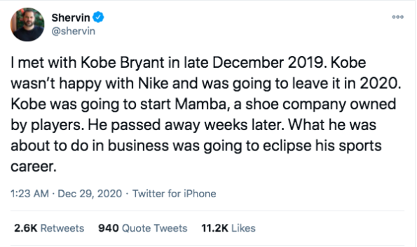 “I met with Kobe Bryant in late December 2019. Kobe wasn’t happy with Nike and was going to leave it in 2020. Kobe was going to start Mamba, a shoe company owned by players. He passed away weeks later. What he was about to do in business was going to eclipse his sports career.