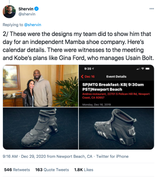 “These were the designs my team did to show him that day for an independent Mamba shoe company. Here’s calendar details. There were witnesses to the meeting and Kobe’s plans like Gina Ford, who manages Usain Bolt.”