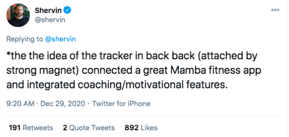 “*the the idea of the tracker in back back (attached by strong magnet) connected a great Mamba fitness app and integrated coaching/motivational features.”