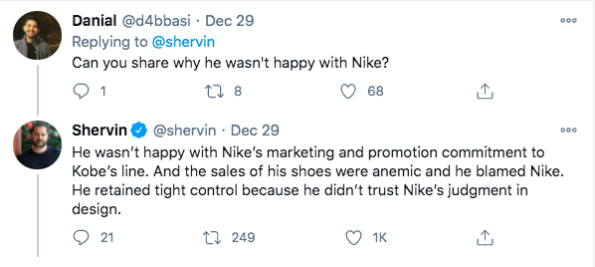 “He wasn’t happy with Nike’s marketing and promotion commitment to Kobe’s line. And the sales of his shoes were anemic and he blamed Nike. He retained tight control because he didn’t trust Nike’s judgment in design.”