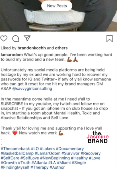 Lamar Odom seems to be dealing with the repercussions of his latest relationship. Recently, the former Lakers player posted a video to his Instagram asking for his fans to help him get his social media accounts back. According to Lamar Odom, his ex is holding his social media platforms hostage. In the caption for his video he wrote,