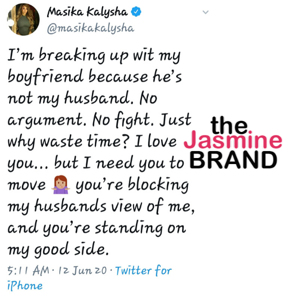 Masika Kalysha has been keeping her love life private, but back in June, she took to Twitter to share that she was ending her then relationship because he wasn’t her husband.
