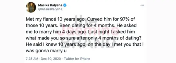 “Met my fiancé 10 years ago. Curved him for 97% of those 10 years. Been dating for 4 months. He asked me to marry him 4 days ago. Last night I asked him what made you so sure after only 4 months of dating? He said I knew 10 years ago, on the day I met you that I was gonna marry u”