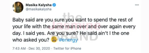 “Baby said are you sure you want to spend the rest of your life with the same man over and over again every day. I said yes. Are you sure? He said ain’t I the one who asked you?#energy”