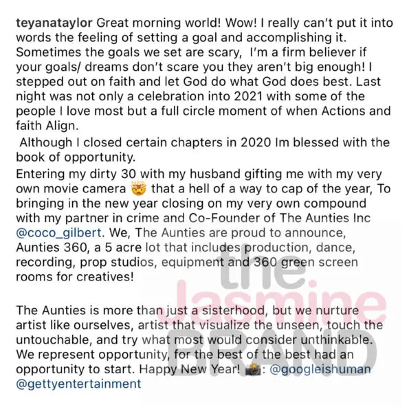 Teyana Taylor is bringing in the New Year with some exciting news! The 30-year-old singer/actress took to Instagram to reflect on her goals and accomplishments from the past year and also shared some exciting news with fans. Teyana Taylor revealed that her company, “Aunties 360” closed on their very own 5 acre compound which will include production, dance, recording, prop studio, equipment and 360 green screen rooms. Teyana wrote: