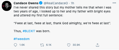 “I’ve never shared this story but my mother tells me that when I was two years of age, I looked up to her and my father with bright eyes and uttered my first full sentence: “Fwee at last, fwee at last, thank God almighty, we’re fwee at last”. Thus, #BLEXIT was born. #Fweedom”