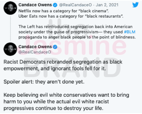 “Racist Democrats rebranded segregation as black empowerment, and ignorant fools fell for it. Spoiler alert: they aren’t done yet. Keep believing evil white conservatives want to bring harm to you while the actual evil white racist progressives continue to destroy your life.”