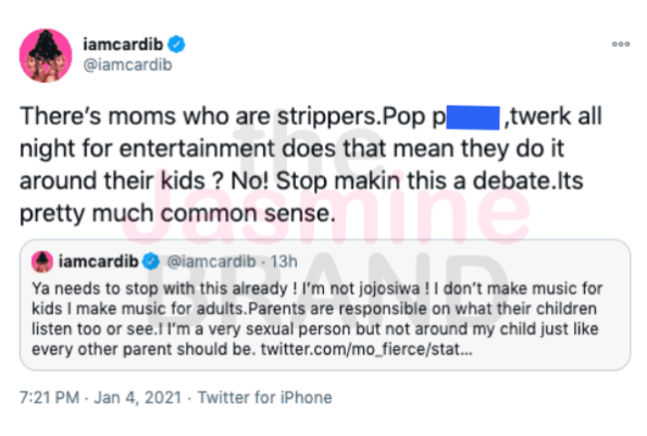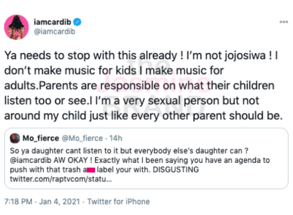 “So ya daughter cant listen to it but everybody else’s daughter can ? @iamcardib AW OKAY ! Exactly what I been saying you have an agenda to push with that trash a– label your with. DISGUSTING”