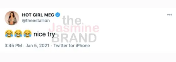 In a series of tweets, Megan Thee Stallion responded to the announcement of the song by saying “nice try” with a laughing emoji.