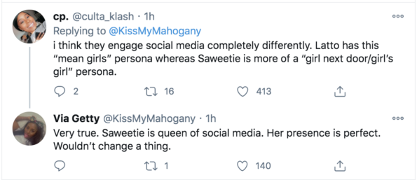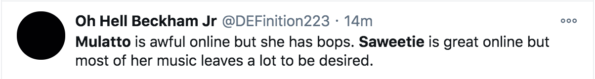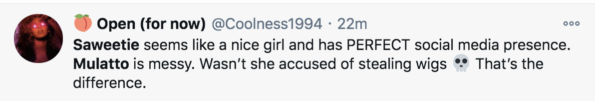 “So besides Mulatto’s name being a slur, what’s the difference between her likability and Saweetie”