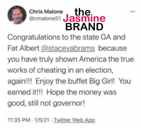 “Congratulations to the state of GA and Fat Albert @staceyabrams because you have truly shown America the true works of cheating in an election again!!! Enjoy the buffet Big Girl! You earned it!!! Hope the money was good, still not governor!”