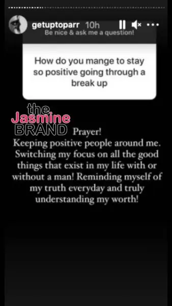 One fan asked her “how do you manage to stay so positive going through a break up [sic]?” She replied,