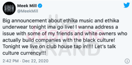 “Big announcement about ethika music and ethika underwear tonight ima go live! I wanna address a issue with some of my friends and white owners who actually build companies with the black culture! Tonight we live on club house tap in!!!! Let’s talk culture currency!!!”