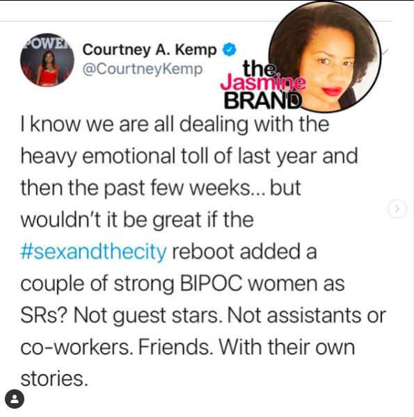 “I know we are all dealing with the heavy emotional toll of last year and then the past few weeks… but wouldn’t it be great if the #sexandthecity reboot added a couple of strong BIPOC women as SRs? Not guest stars. Not assistants or co-workers. Friends. With their own stories.”