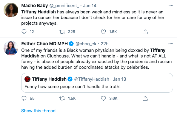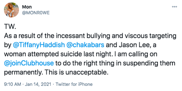 Multiple people called out Tiffany Haddish and popular social media user @Chakabars (in addition to Jason Lee and Joe Budden) for allegedly creating a room in Clubhouse just to attack medical professionals and spread false information about COVID-19. According to the allegations against Tiffany Haddish, she said that the coronavirus was invented by the government and social distancing is so satellites can do facial recognition. Some Clubhouse users also claimed that a doctor Tiffany Haddish allegedly doxxed (spread her private information) attempted suicide.
