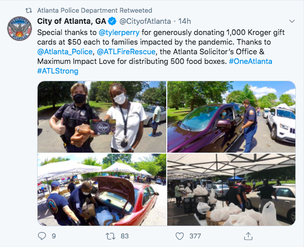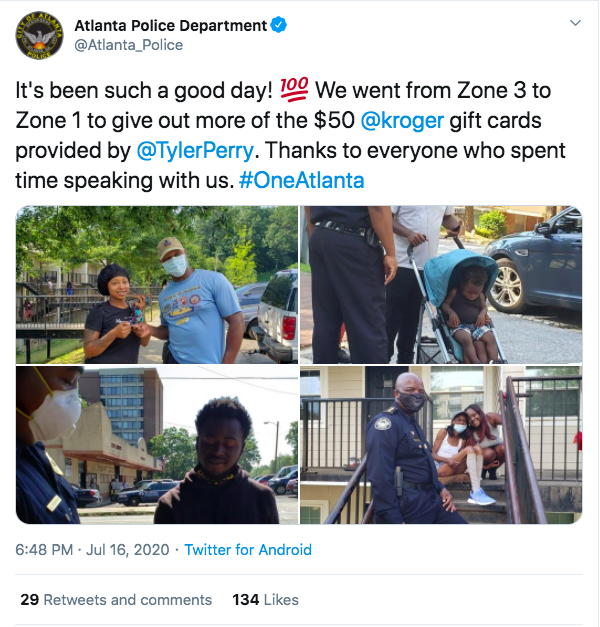 In July of the same year, he purchased more than 1,000 Kroger supermarket gift cards and donated them to the Atlanta Police Department to hand out to Atlanta residents. The purpose of this was to help bridge the gap between the ADP and the communities they serve. Following his good deed, Tyler Perry released a statement that said,