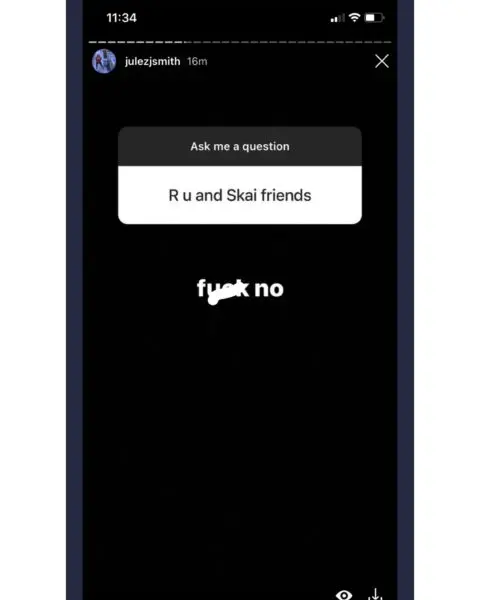 Earlier this week, Julez did a Q&A session on his Instagram Story. Someone asked if he and Skai are still friends. He replied,