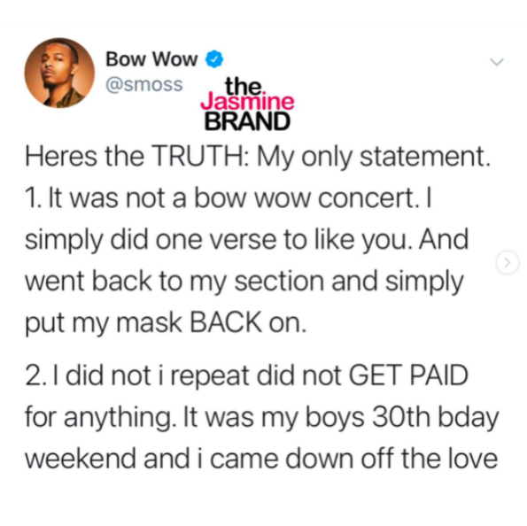 “Heres the TRUTH: My only statement. 1. It was not a bow wow concert. I simply did one verse to like you. And went back to my section and simply put my mask BACK on.
