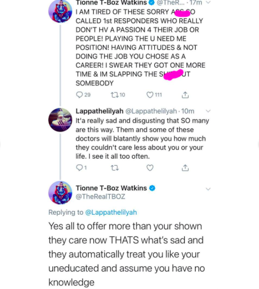 “I AM TIRED OF THESE SORRY A– SO CALLED 1st RESPONDERS WHO REALLY DON’T HV A PASSION 4 THEIR JOB OR PEOPLE! PLAYING THE U NEED ME POSITION! HAVING ATTITUDES & NOT DOING THE JOB YOU CHOSE AS A CAREER! I SWEAR THEY GOT ONE MORE TIME & IM SLAPPING THE S— OUT SOMEBODY”