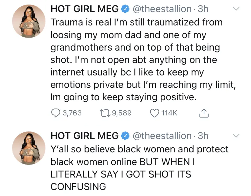 “Y’all so believe black women and protect black women online BUT WHEN I LITERALLY SAY I GOT SHOT ITS CONFUSING. Trauma is real I’m still traumatized from loosing [sic] my mom dad and one of my grandmothers and on top of that being shot. I’m not open abt anything on the internet usually bc I like to keep my emotions private but I’m reaching my limit, Im going to keep staying positive.”
