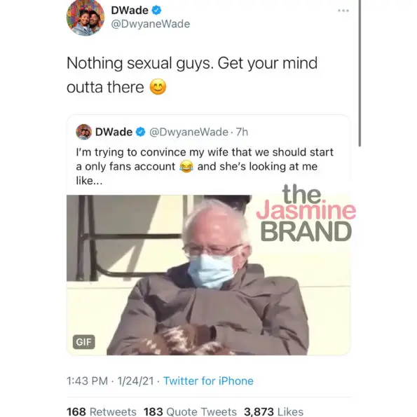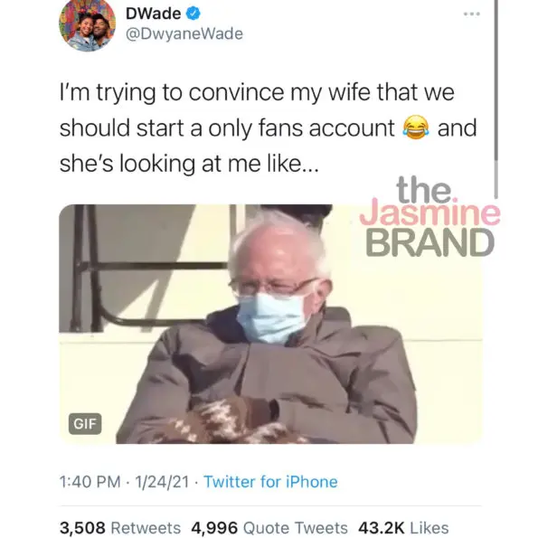 Dwyane Wade is teasing the idea of creating an OnlyFans account however, he doesn’t want to do it alone. The 39-year-old NBA star took to Twitter Sunday (Jan.24) to let fans know that he wants to start an Only Fans with his wife, Gabrielle Union but she is not in agreement. Dwyane Wade inserted Barne Sanders’ viral meme from last week’s Presidential Inauguration and wrote,