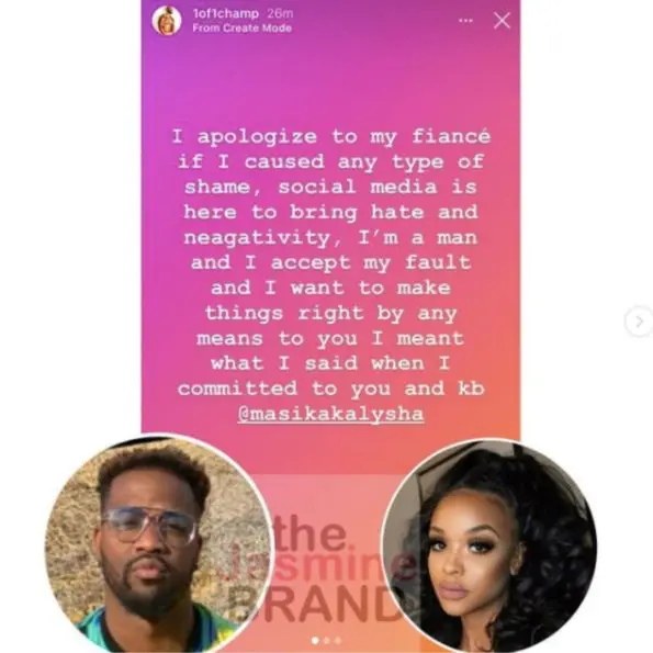 “I apologize to my fiancé if I caused any type of shame, social media is here to bring hate and negativity, I’m a man and I accept my fault and I want to make things right by any means to you. I meant what I said when I committed to you and kb @masikakalysha.”