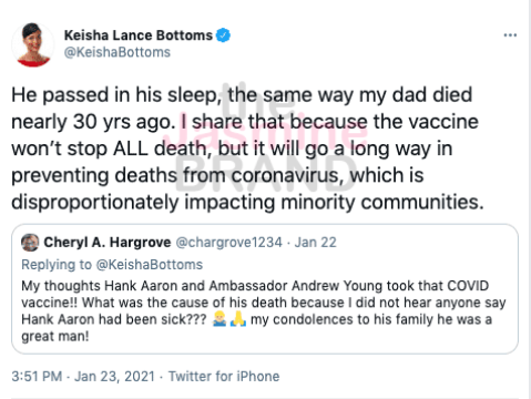 Atlanta mayor Keisha Lance Bottoms also shut down reports that Hank Aaron passed away due to the coronavirus vaccine.