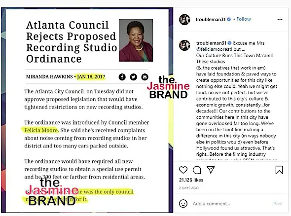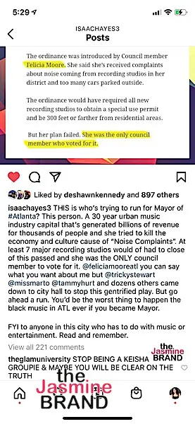 We’re told that the entire situation started when T.I. made a post about Felicia Moore, a candidate for Mayor and friend of Sabrina Peterson who is running against Keisha Lance Bottoms, who T.I. has supported through her term.