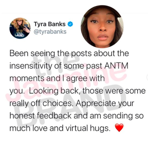 “Been seeing the posts about the insensitivity of some past ANTM moments and I agree with you. Looking back, those were some really off choices. Appreciate your honest feedback and am sending so much love and virtual hugs.”