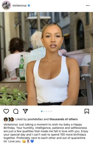 “Just taking a moment to wish my baby a Happy Birthday. Your humility, intelligence, patience and selflessness are just a few qualities that made me fall in love with you. Enjoy your special day and I can’t wait to spend 100 more birthdays together. Preferably next to each other and out of quarantine lol. Love you”