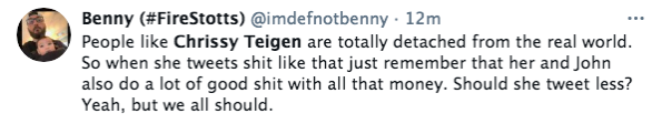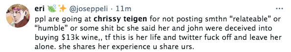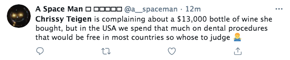 Chrissy Teigen is facing backlash after receiving criticism for being ‘unrelatable’ via one of her tweets. The 35-year-old model, chef and TV personality began trending on social media after she tweeted about her and her husband (John Legend) being charged for an expensive bottle of wine. She tweeted,