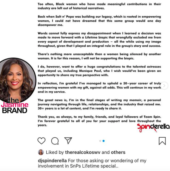 Spinderella said in an open letter on Instagram ahead of the film airing on Lifetime: