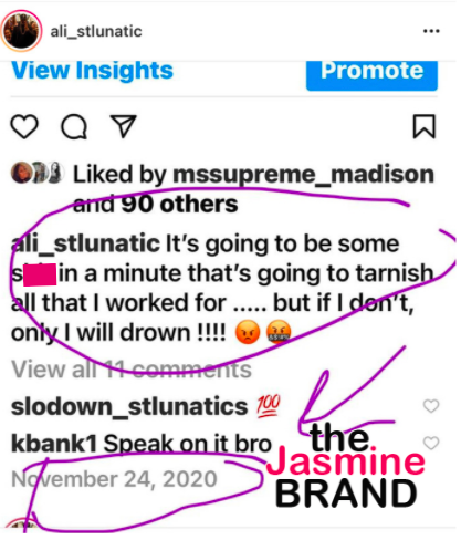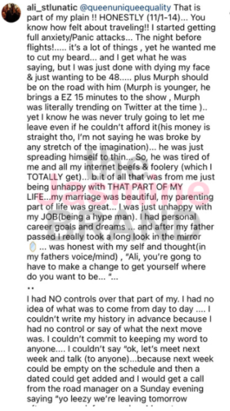 “When they said the Lunatics was doing all the legwork and talent shows and all of that, that was us. He didn’t do that. When we was going around town making a name for ourselves, doing the car wash, performing at the talent shows at [colleges], that was us, that wasn’t Ali. Ali did not perform with us. Either he thought he was too good or he didn’t perform with us. Either way, he did not perform with us. Just factuals. Actual factuals.”