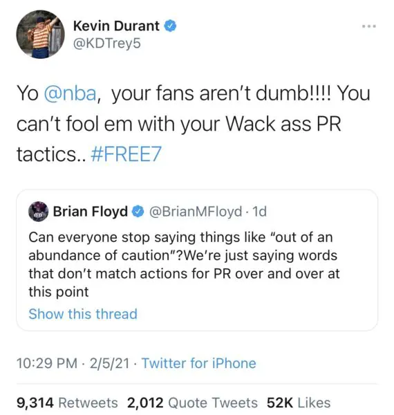 “Yo @nba, your fans aren’t dumb!!!! You can’t fool em with your Wack ass PR tactics.. #FREE7.”