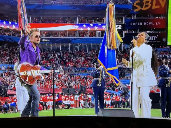 Jazmine Sullivan and Eric Church performed a duet, singing the National Anthem today (Feb. 7th) for the Super Bowl LV Pregame Show.