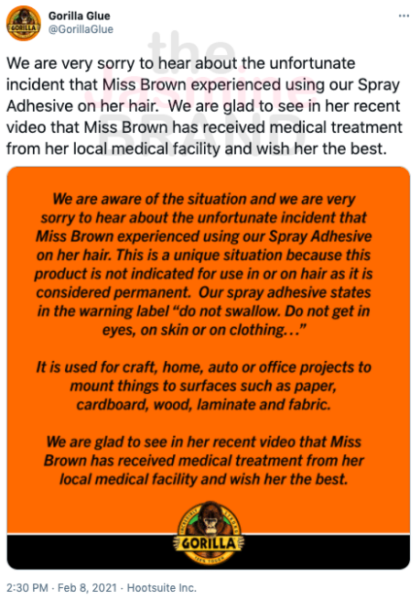 “We are very sorry to hear about the unfortunate incident that Miss Brown experienced using our Spray Adhesive on her hair. We are glad to see in her recent video that Miss Brown has received medical treatment from her local medical facility and wish her the best.”