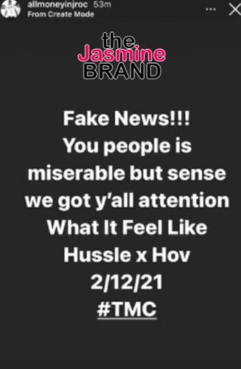 “Fake News!!! You people is miserable but sense [sic] we got y’all atention What It Feel Like Hussle x Hov 2/12/21”