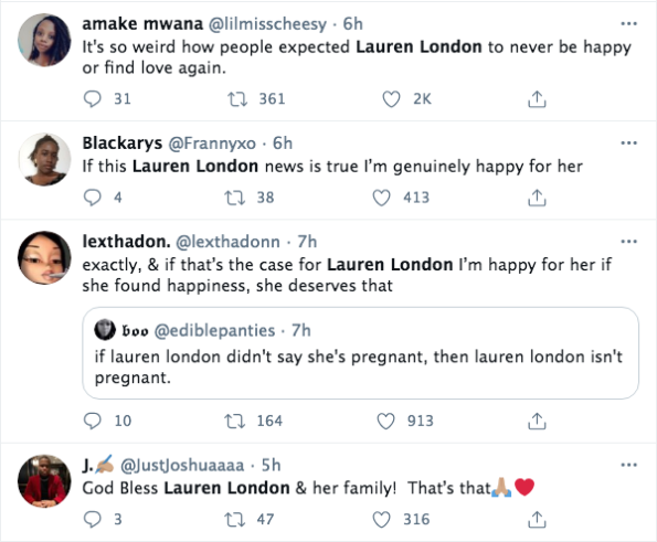 Original Story: Lauren London is the latest celebrity trending on social media. Overnight, unconfirmed rumors began to spread on Twitter, alleging that the 36-year-old actress was pregnant. No word on how the rumor began, but social media certainly weighed in. See some reactions below.