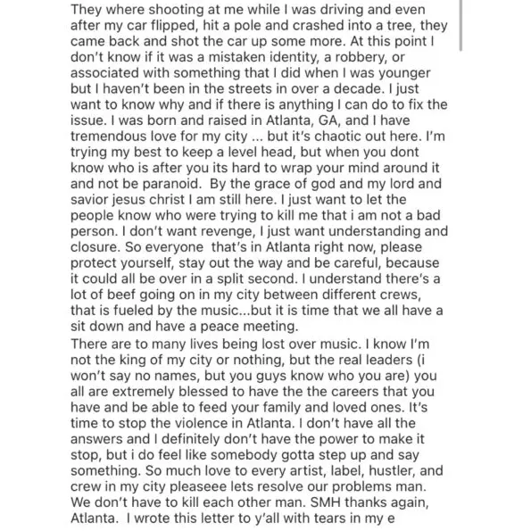 “I just want to let the people know who were trying to kill me that i am not a bad person. I don’t want revenge, I just want understanding and closure. So everyone that’s in Atlanta right now, please protect yourself, stay out the way and be careful, because it could all be over in a split second. I understand there’s a lot of beef going on in my city between different crews, that is fueled by the music…but it is time that we all have a sit down and have a peace meeting.”