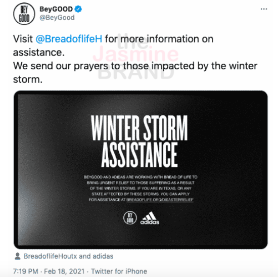 Beyonce’s BeyGOOD Org Teams Up With Adidas To Provide $1,000 For Texans Impacted By Severe Storms