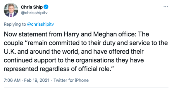 “Following conversations with The Duke, The Queen has written confirming that in stepping away from the work of The Royal Family it is not possible to continue with the responsibilities and duties that come with a life of public service. The honorary military appointments and Royal patronages held by The Duke and Duchess will therefore be returned to Her Majesty, before being redistributed among working members of The Royal Family.”