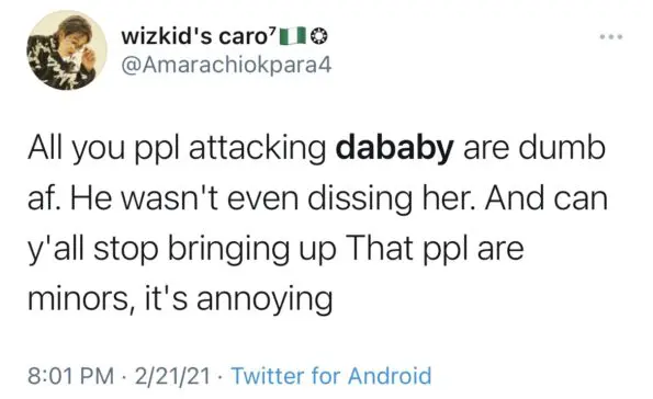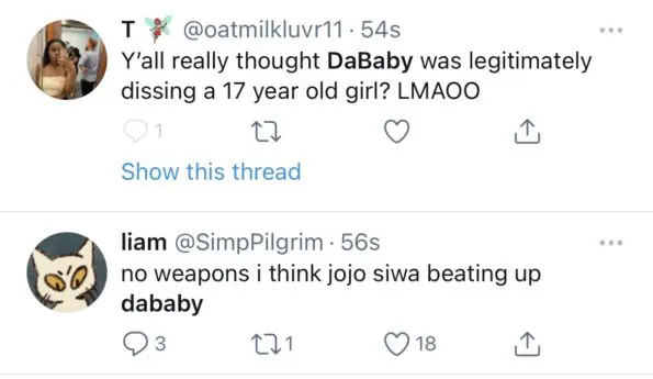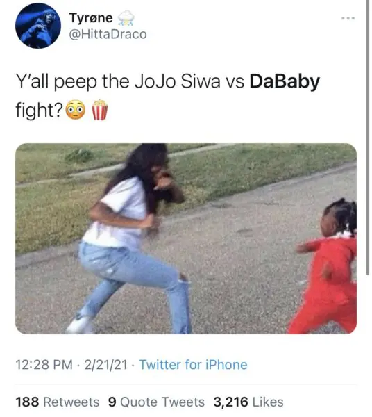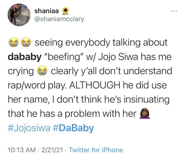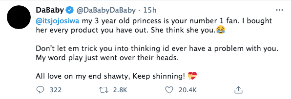 DaBaby took to Twitter Sunday (Feb.21) to respond to the backlash that he as receiving. The rapper poked fun at the situation seemingly confirming his use of Jojo’s name was a play on words for the song. He wrote,