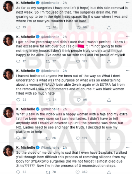 “So the video of me dancing is sad that I even have 2explain. I walked y’all through how difficult this process of removing silicone from my body for 3YEARS/16 surgeries Did we not forget I almost died due 2this?????? Now i’m in the process of 3 reconstruction steps.What u saw in the video was a happy woman with a faja and my extra fat! I’ve been very open so I can heal ladies. I didn’t have to tell anybody and I could’ve covered up until the process was done,but NO. Ladies need to see and hear the truth. I decided to use my platform to help.I havent bothered anyone Ive been out of the way so What I dont understand is what was the purpose or what was so entertaining about a woman FINALLY bein able 2walk again with EXTRA fat from the removal.I saw the comments and of course it was Black women filled with so much hate”